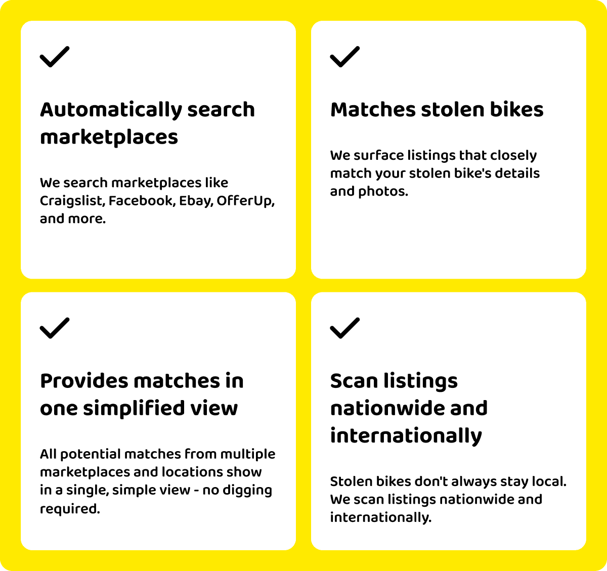 Until now, searching for a stolen bike meant hours of scrolling and hoping. Thieves move fast, listings move faster, and the chances of recovery drop as time passes.